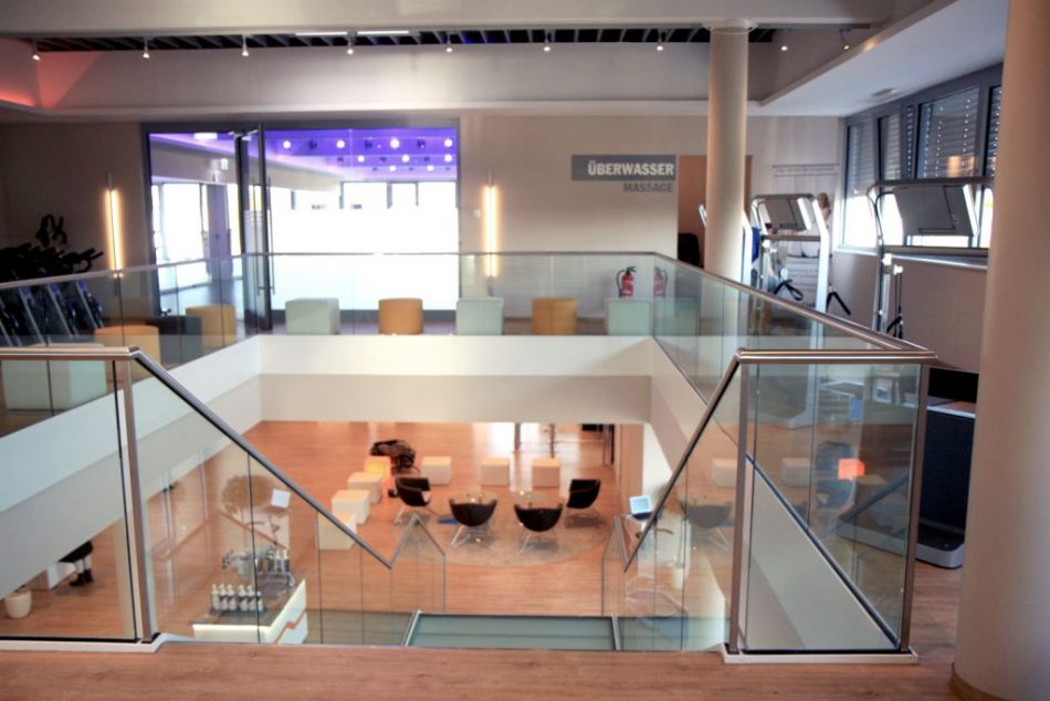 Inmitten eines modernen Fitnessstudios breiten sich großzügige Trainingsbereiche aus, die über zwei Etagen inklusive einer Galerie verlaufen. Eine offene Treppe verbindet diese beiden Ebenen und trägt maßgeblich zu einem beeindruckenden Raumgefühl bei. Die Verteilung der Trainingsflächen auf die Etagen ist dabei sorgfältig nach den Bedürfnissen der verschiedenen Nutzergruppen geplant. Als besonderes Highlight rundet der Wellnessbereich im Obergeschoss das vielfältige Angebot des Studios perfekt ab.