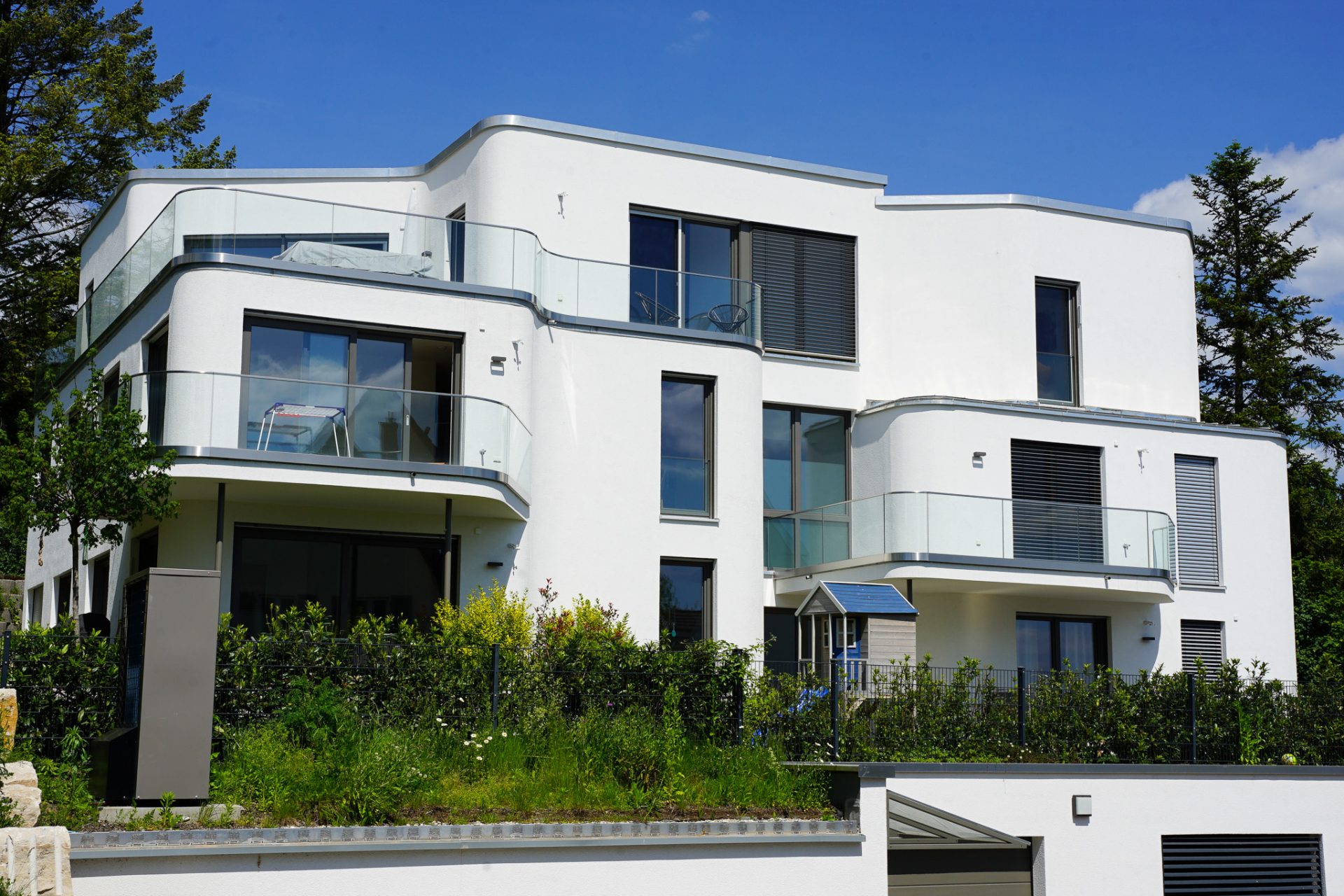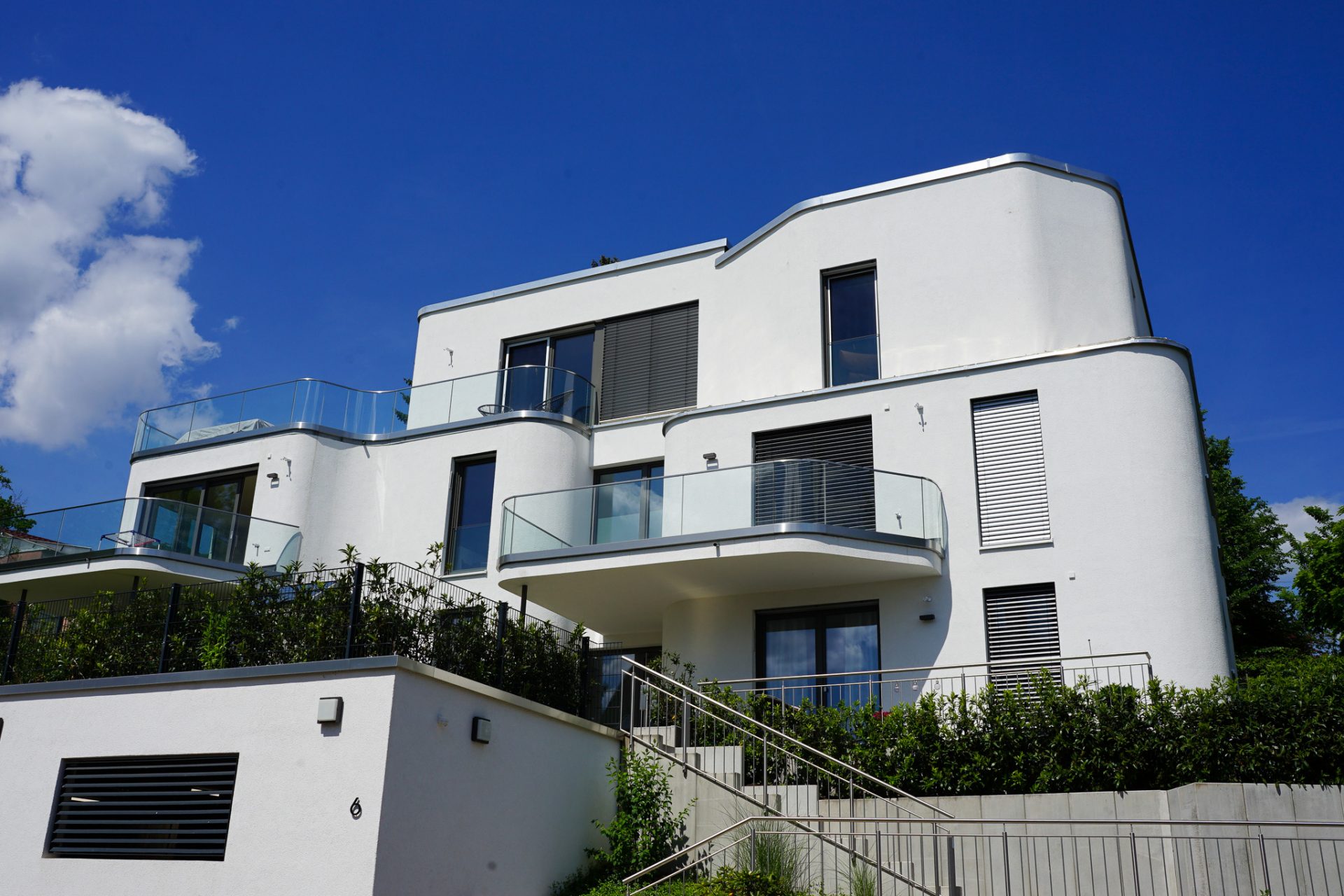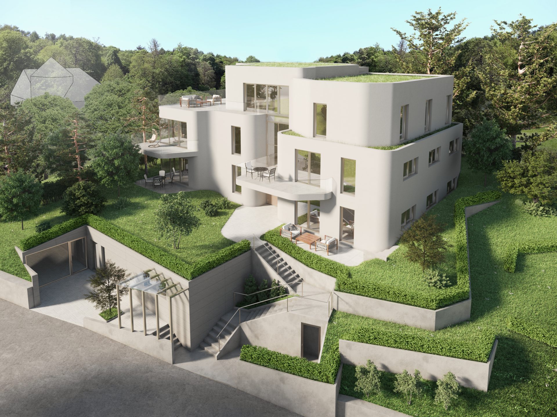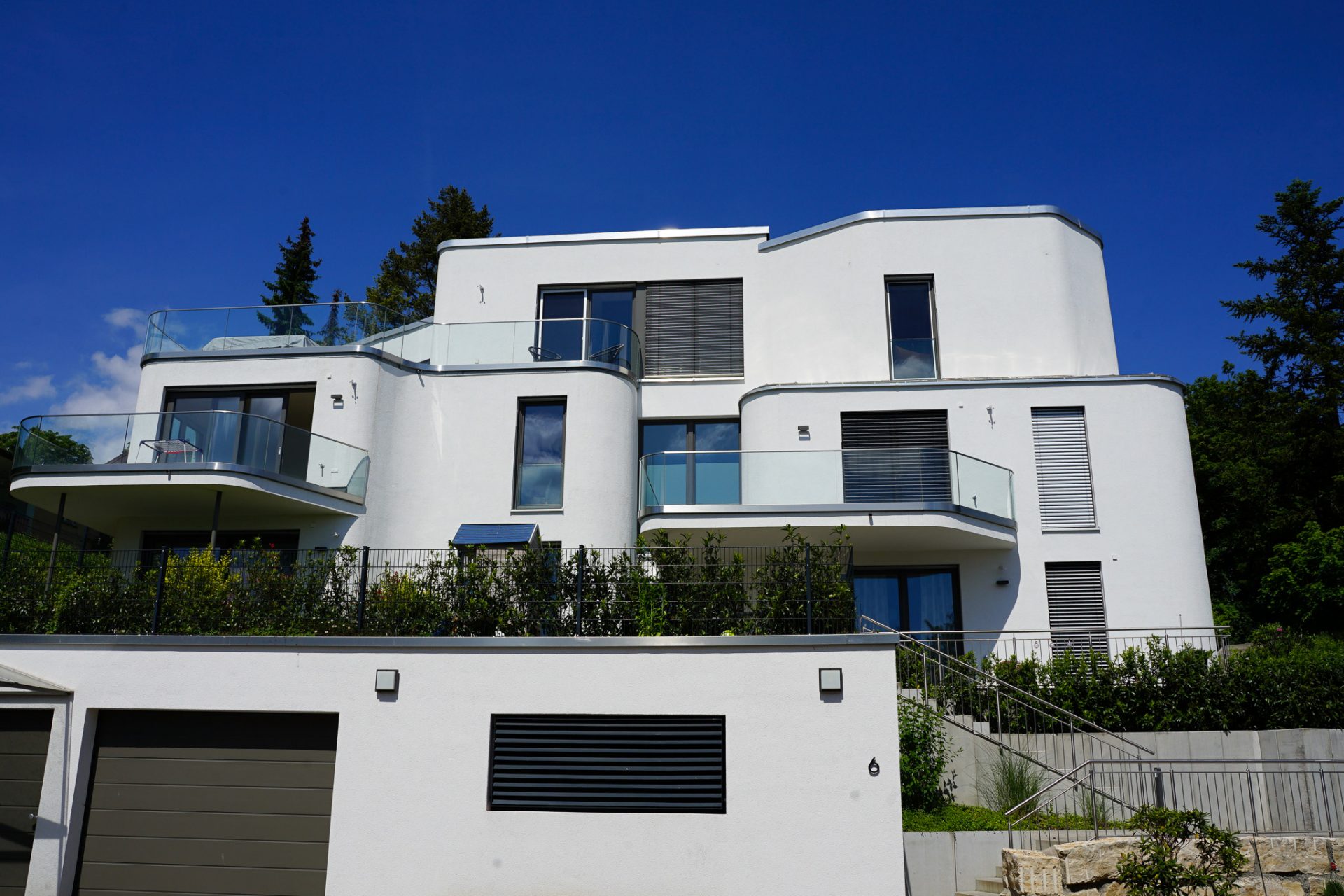 Der Baukörper gliedert sich harmonisch in den bestehenden Hangverlauf ein, und überzeugt durch seine klare, geometrische Formensprache. Terrassen, Balkone und Wohnbereiche sind zur Aussichtsseite orientiert. Die Innenräume machen Sichtachsen, Lichtverläufe und eine großzügige Durchgängigkeit erlebbar, und sind auf die Ansprüche an eine moderne Wohnsituation angepasst. Auch in Sachen Nachhaltigkeit leistet die Stadtvilla Dämmelstraße einen überzeugenden Beitrag: Das Gebäude entspricht aktuellen, energieeffizienten Standards und verfügt über aktuelle haustechnische Installationen und Anlagen, unter anderem durch die umweltfreundliche Nutzung regenerativer Energien. Moderne Systeme stehen für energieeffizientes Heizen und Lüften, und vor allem für ein angenehmes Wohlfühlklima.